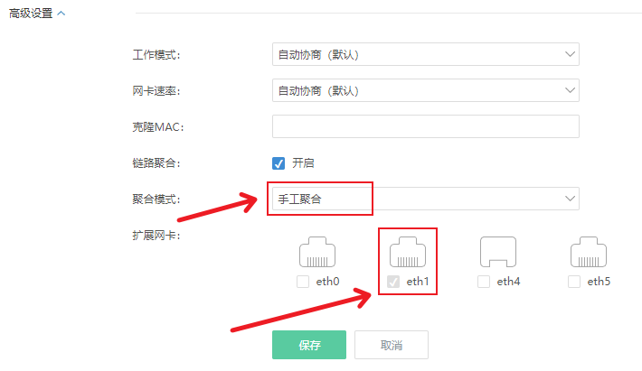 只以爱快为例,选择WAN口设置点击最下面的高级设置。点击链路聚合开关,选择聚合模式为手工聚合。在下面的扩展网卡中选中你连到光猫上的另一个有线网卡保存即可